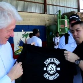 Mike Shinoda, vocalista de Linkin Park, le muestra al ex-presidente de EEUU, Bill Clinton, las instalaciones de Sustainable Recycling Solutions, una empresa sita en Haiti que se encarga de fabricar camisetas y mochilas de Linkin Park a partir de residuos plásticos. Como sabéis, los angelinos siempre se han mostrado muy activos ayudando en cuantas tareas humanitarias les fuese posible en la isla antillana que sufrió un devastador terremoto en 2010.