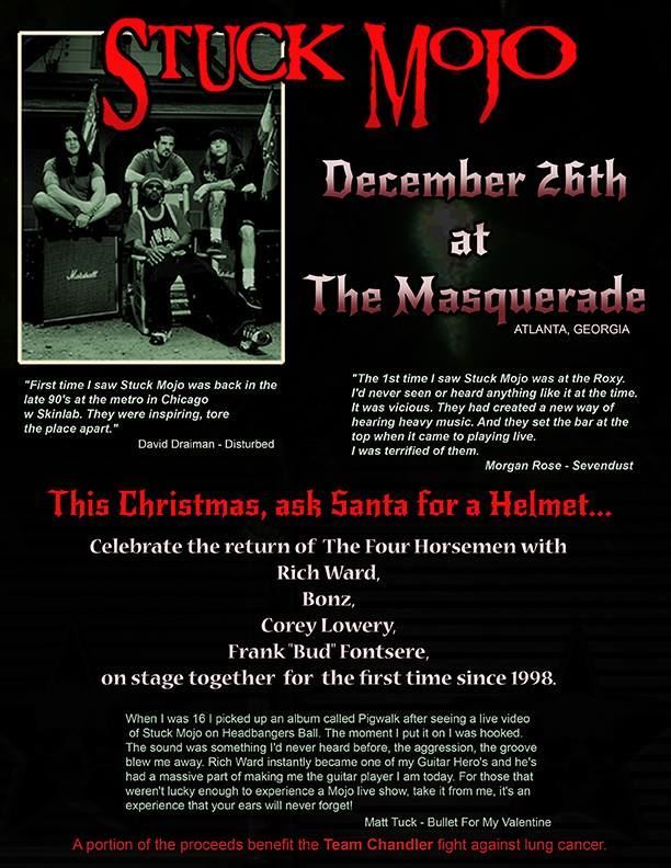 Los rap-metaleros Stuck Mojo reunieron su formación original en un concierto en The Masquerade de Atlanta, el pasado viernes 26. Así, Bonz (voz), Rich «The Duke» Ward (guitarra), Corey Lowery (bajo) y Frank Fontsere (batería) volvieron a subirse juntos a un escenario desde 1998. Vía Blabbermouth podemos ver algunos vídeos grabados por asistentes al concierto.