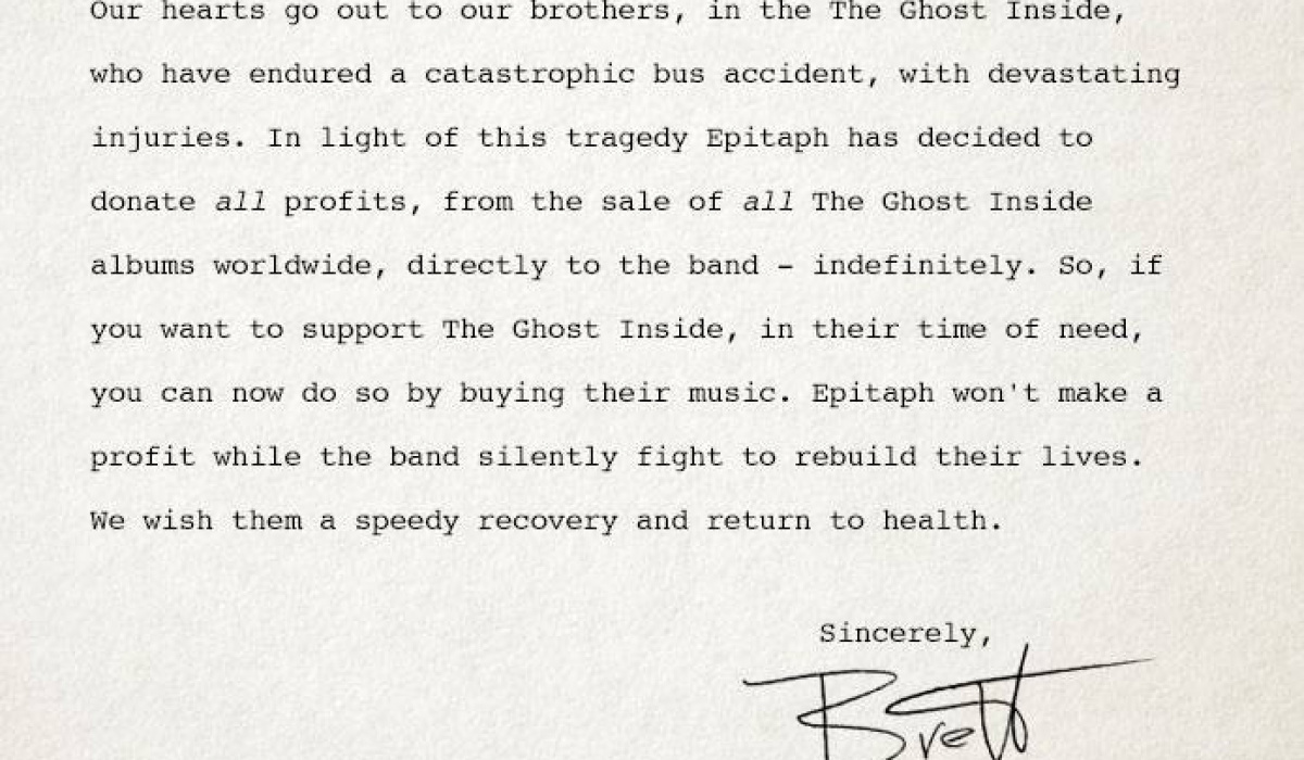El sello de The Ghost Inside, Epitaph Records, ha decidido echarles una mano y destinar todo lo recaudado por las ventas de discos y singles directamente al grupo en lugar de hacer lo habitual: quedarse con un porcentaje de las ventas. Lo ha hecho saber el fundador y presidente del sello, Brett Gurewitz, vía redes sociales.